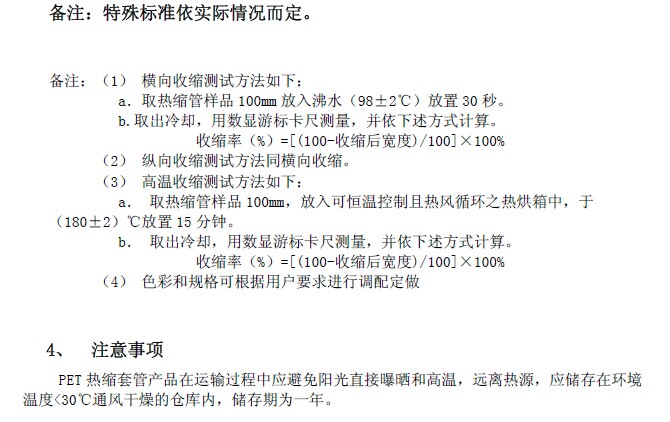 PET热缩管环保性能高于欧盟RoHs指令标准,不含镉(Cd)、铅(Pb)、汞(Hg)、六价铬(CrVI)、多溴联苯(PBBs)、多溴联苯醚(PBBEs/PBDEs) ,多氯联苯(PCB),多氯三联苯(PCT),多氯化萘(PCN)等1级环境管理禁用物质。是电解电容器、电感等电子元器件、高档充电电池 ,玩具及医疗器械的外包覆,完全能满足出口要求。